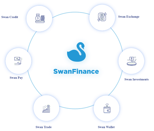The Swan Ecosystem We start with SwanFinance. But this is just the beginning of the Swan ecosystem, which will include: SwanCredit, SwanInvestments, SwanPay, Swan.Exchange, SwanTrade and SwanWallet. There will be more ways to get benefits and discounts for staking and using SWAN tokens.